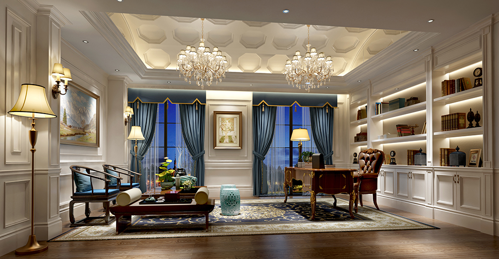 房屋建筑面積201平方,5室2廳2衛;應業主要求,結合房屋結構,將不規則、面積較小的一室整體融合成為內退密室,書柜內退,空間開啟;清新不落俗套,白色灰泥墻結合湛藍窗簾,起伏的羅馬線條和柜門裝飾,挑高大面窗的書房,讓人心神蕩漾。